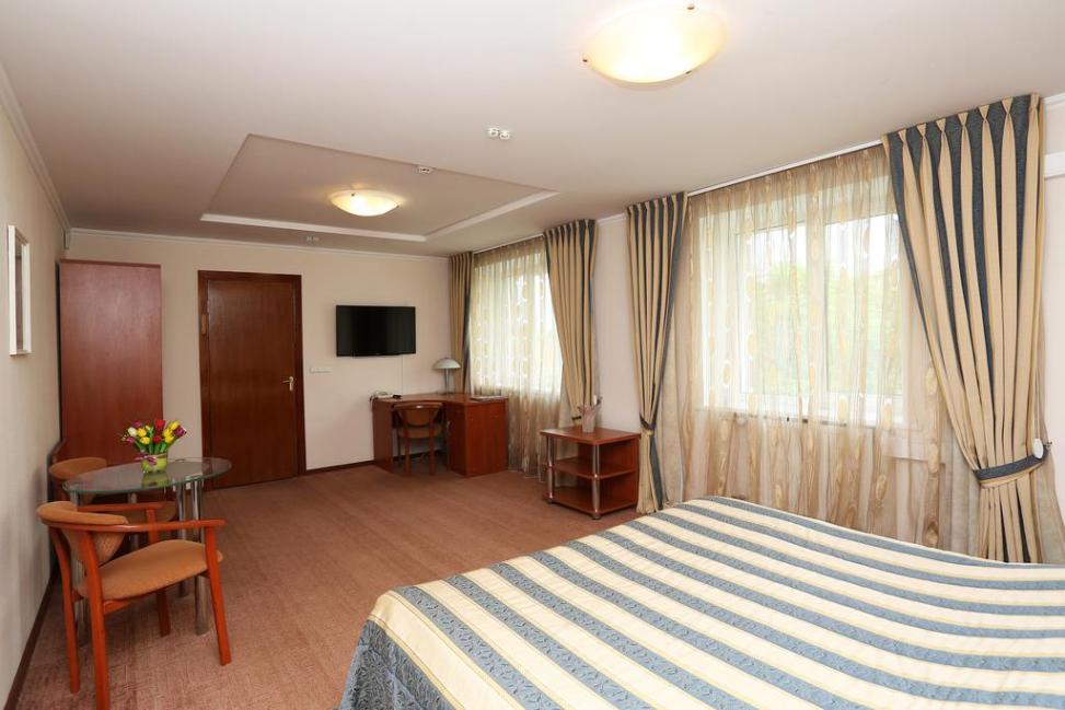 1-комнатный (ДАБЛ УЛУЧШЕННЫЙ): кровать «King size» (1,9 х 2 м); Wi-Fi; спутниковое телевидение; телевизор с плоским экраном; телефон; мини-холодильник; светильник; стулья; настольные лампы; тумбы; письменный стол; зеркало; шкаф для одежды; ковровое покрытие; ванна; комплект полотенец; гигиенические средства; тапочки; фен; кулер на этаже.
