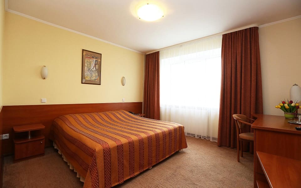 1-комнатный 2-местный (ТВИН): две односпальные кровати (1 х 2 м); Wi-Fi; спутниковое телевидение; телевизор с плоским экраном; телефон; мини-холодильник; настольная лампа; тумбы; стулья; письменный стол; зеркало; светильник; шкаф для одежды; ковровое покрытие; ванна или душевая кабина; комплект полотенец; кулер на этаже.