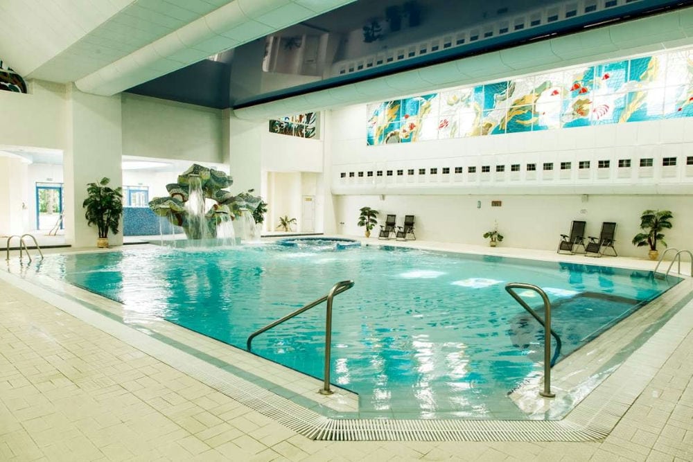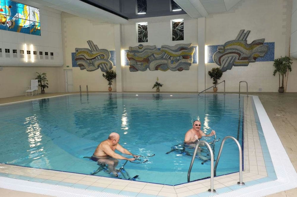 Крытый, размером 13м*15м, с пресной водой, пользование бассейном входит в стоимость согласно количеству дней путёвки, время работы круглогодично(по расписанию), расположен в лечебном корпусе санатория. (входит в стоимость путевки)