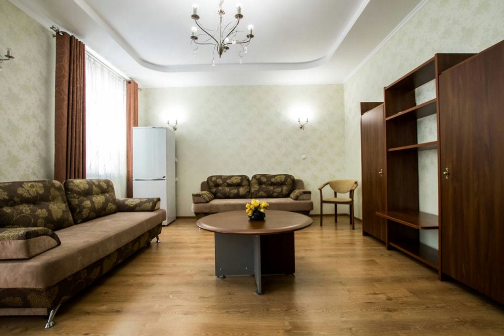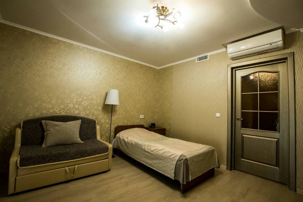 Мебель: 2 односпальные кровати, раскладной диван, 2 прикроватные тумбочки, стол для жилой комнаты, 2 стула полумягкий.
