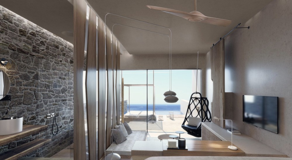 - Loft Suite с частным бассейном: Площадь 55 м². Эти сьюты отличаются высокими потолками и просторной террасой с частным бассейном, откуда открывается захватывающий вид на Эгейское море. Интерьер выполнен в современном стиле с использованием натуральных материалов.