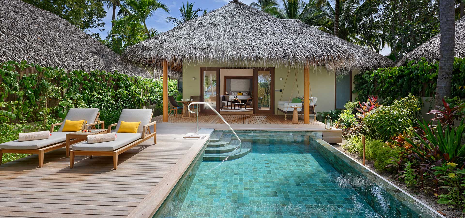 Water Pool Villa (126 м², макс. 3 чел.).Расположены над лагуной, двуспальная кровать king size, гостиная зона с кушеткой, ванная комната с ванной и душем, частный бассейн , терраса с лежаками и кушеткой с балдахином, спуск с террасы в лагуну, вид на океан;