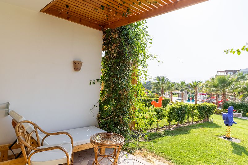 Family Room (44 м2, терраса, вид на море / сад / частичный вид на море, расположены на первом этаже и оснащены кроватью размера «king-size» и ванной комнатой, Минимальная вместимость: 2 взрл.+ 2 реб.);