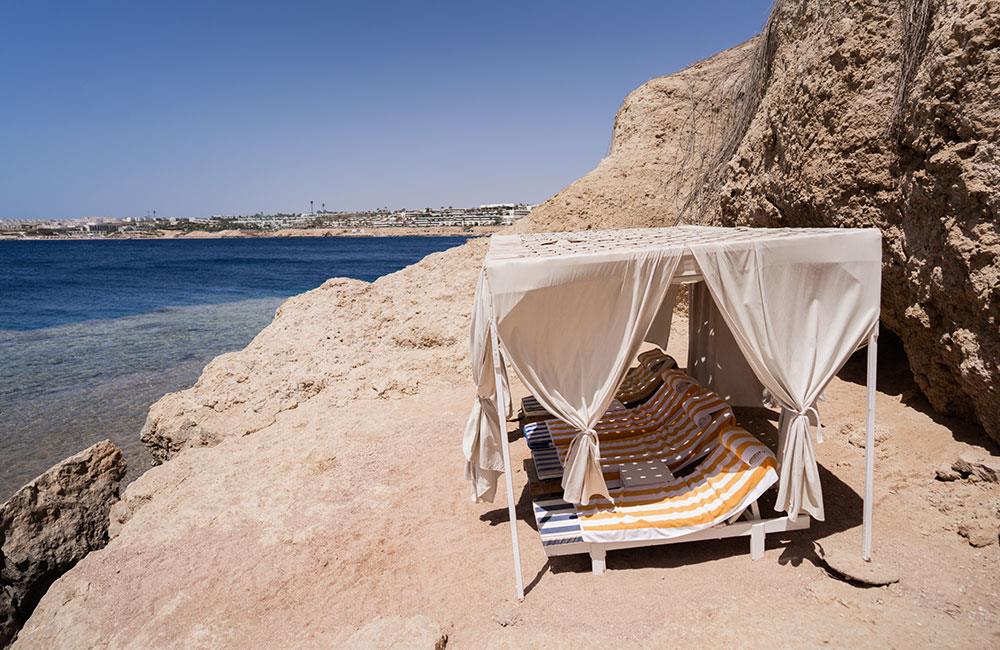- 600-метровый каменистый пляж, разделенный на 4 уровня, каждый из которых простирается на 150 метров в длину.