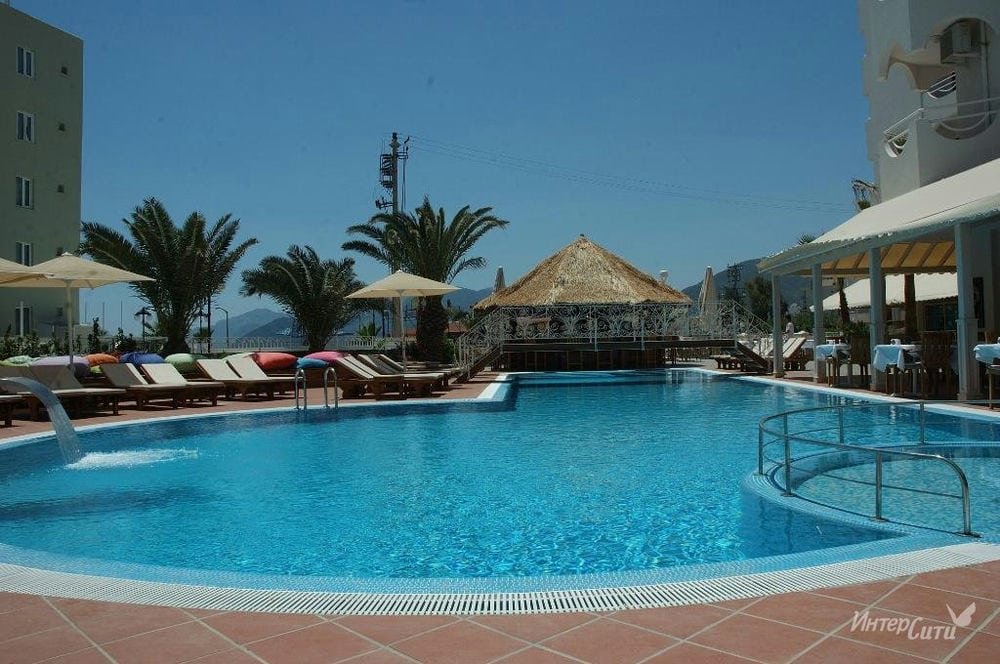в 85 км от аэропорта г. Даламан, в центре г. Мармарис, на второй линии, в 20 м от городского пляжа.