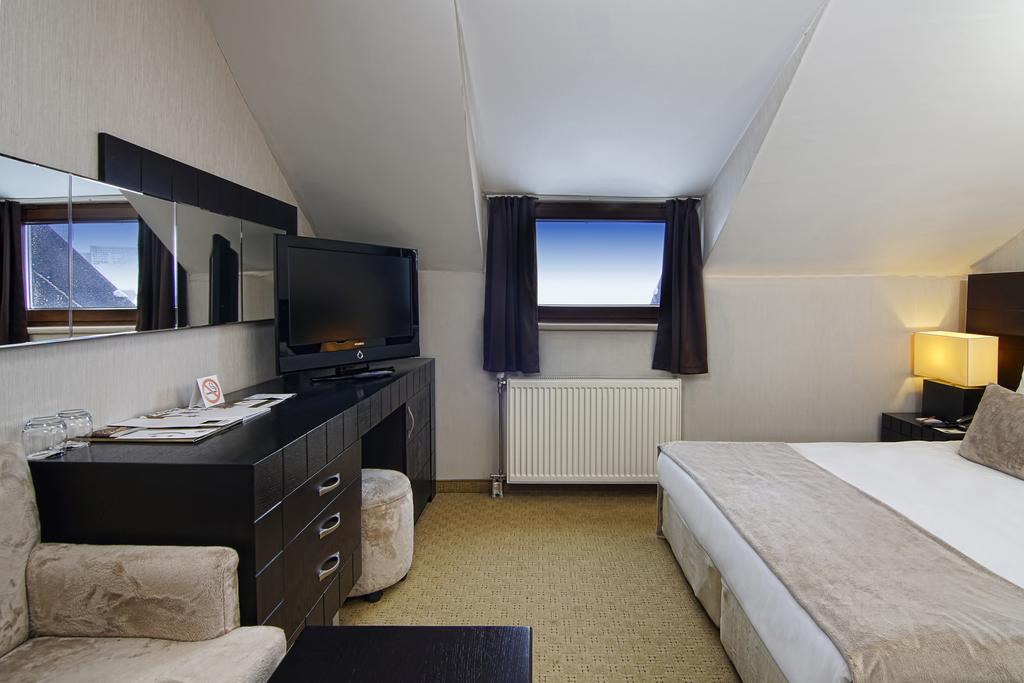 Вместимость наших мансардных комнат шириной 18-22 m² подходит как минимум для 1 максимум 2 человек. Комнаты с ковровым покрытием