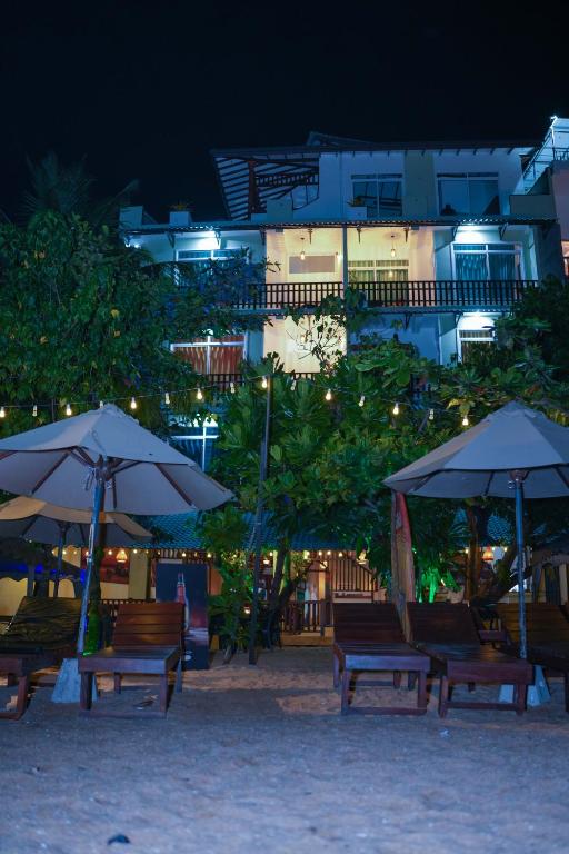 шезлонги, зонтики.