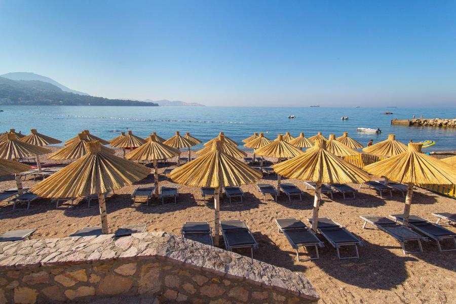 Собственный пляж (мелкая галька). Лежаки/зонты бесплатно.