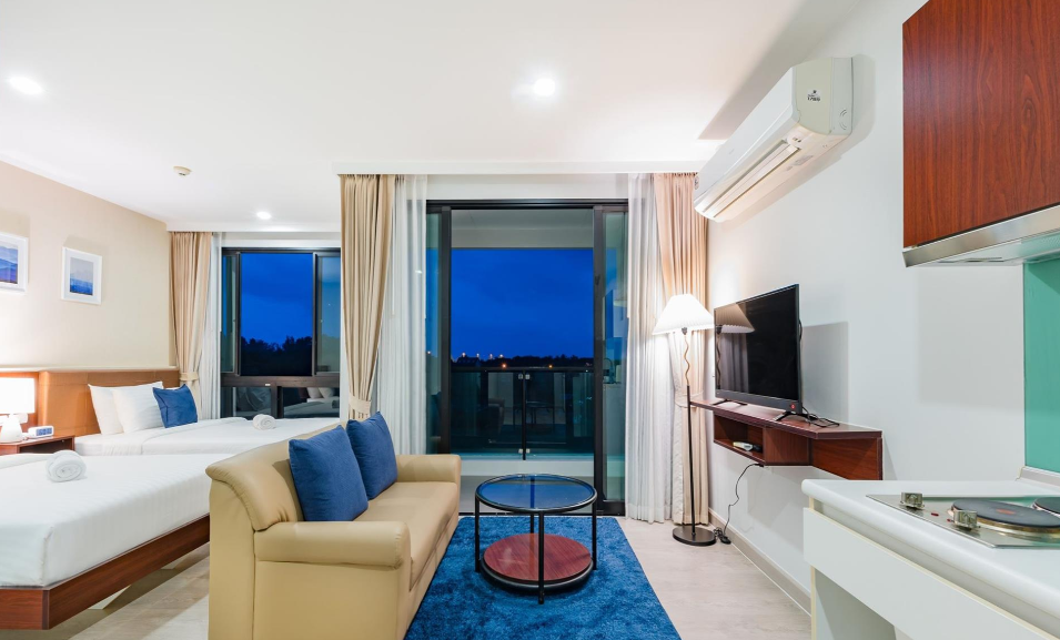 - Superior Room (1-8 этаж, 36 кв.м., спальня, 2 односпальные кровати, межкомнатная дверь, гостиная, диван, мини-кухня, ванная комната, балкон, вид на сад/бассейн)