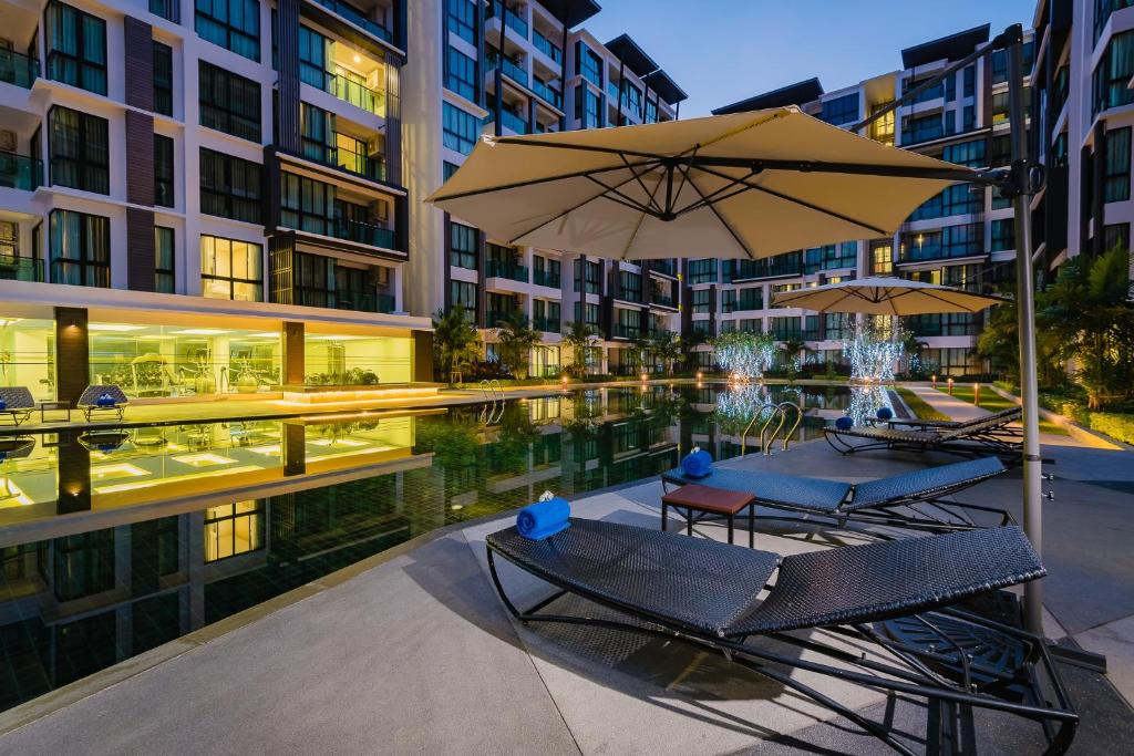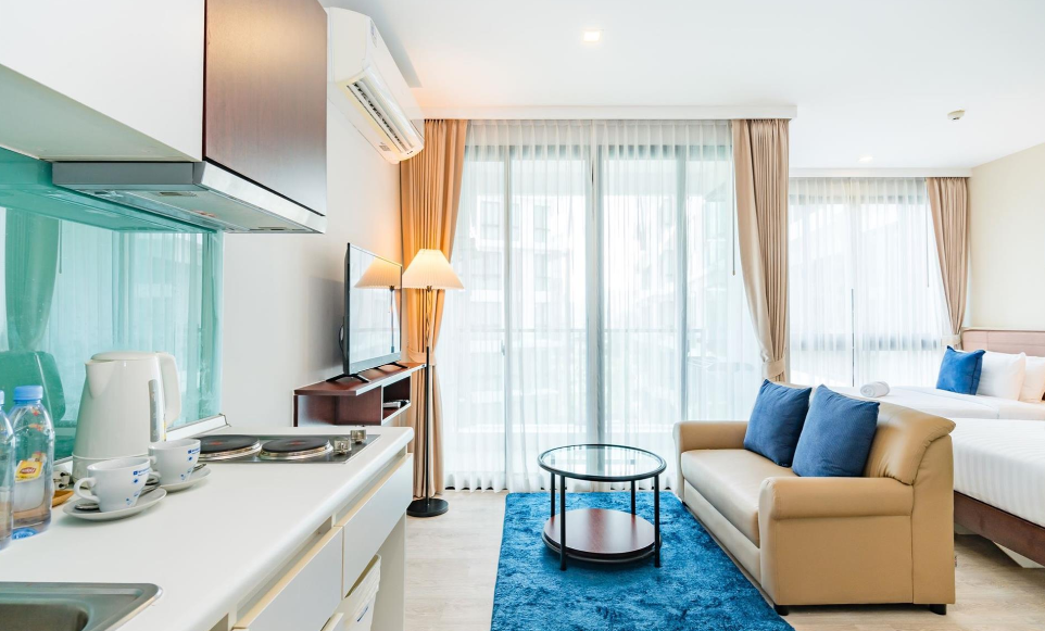 - Studio Room (1-8 этаж, 32 кв.м., макс. 3 чел., спальня, 2 односпальные кровати, диван, мини-кухня, ванная комната, балкон, вид на сад/бассейн)